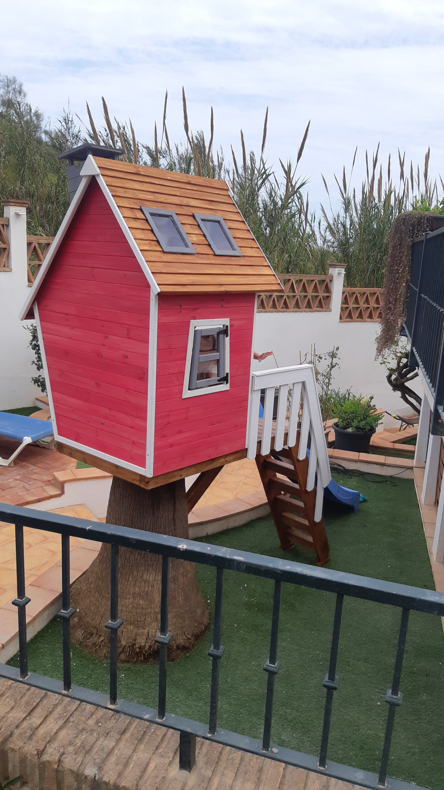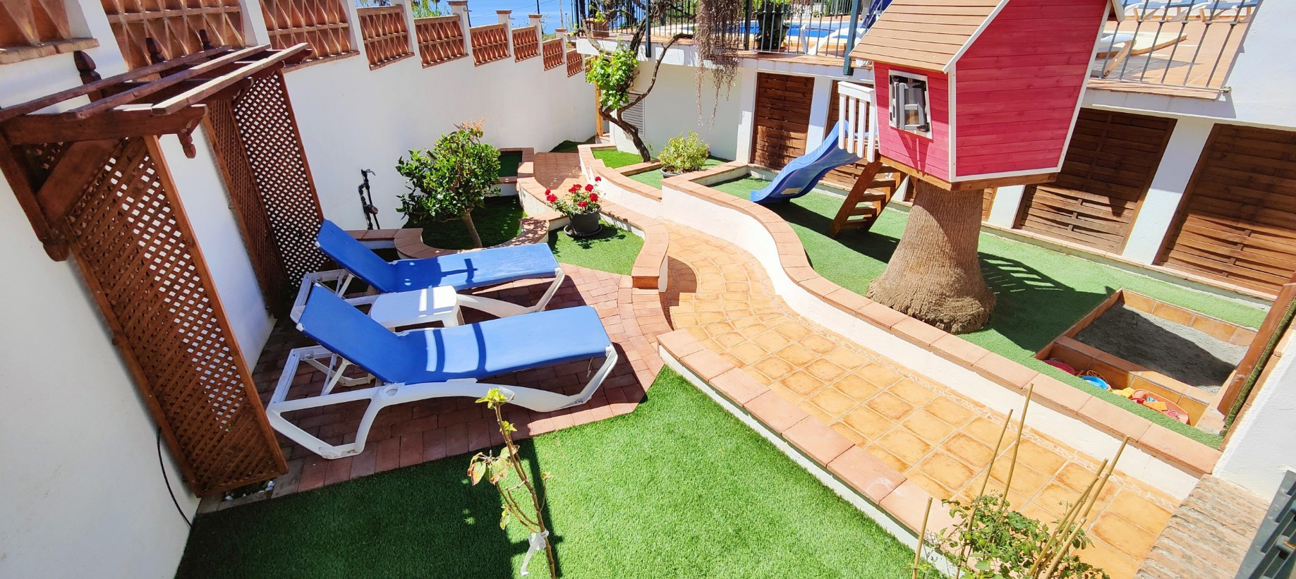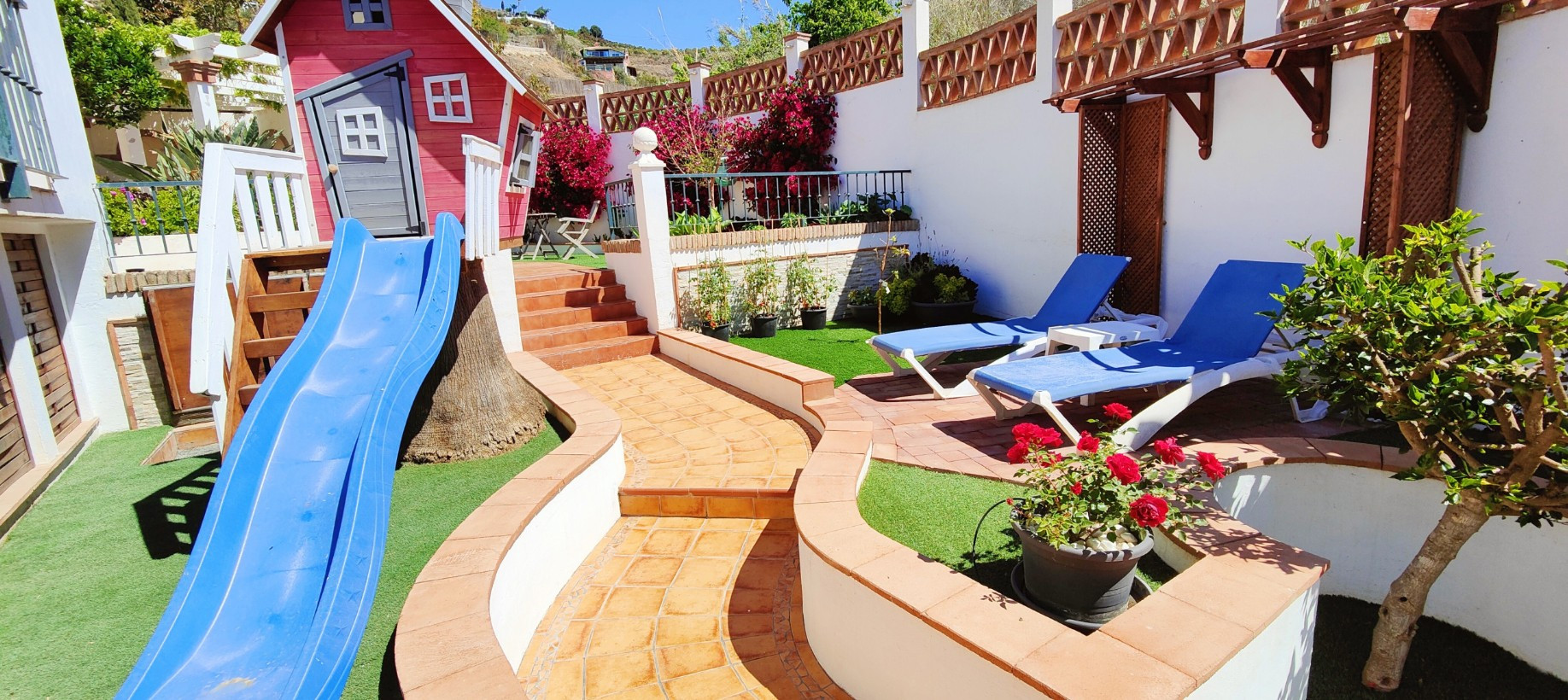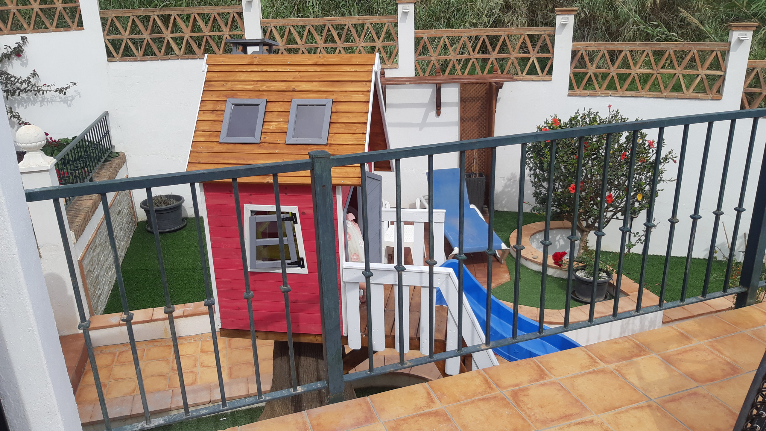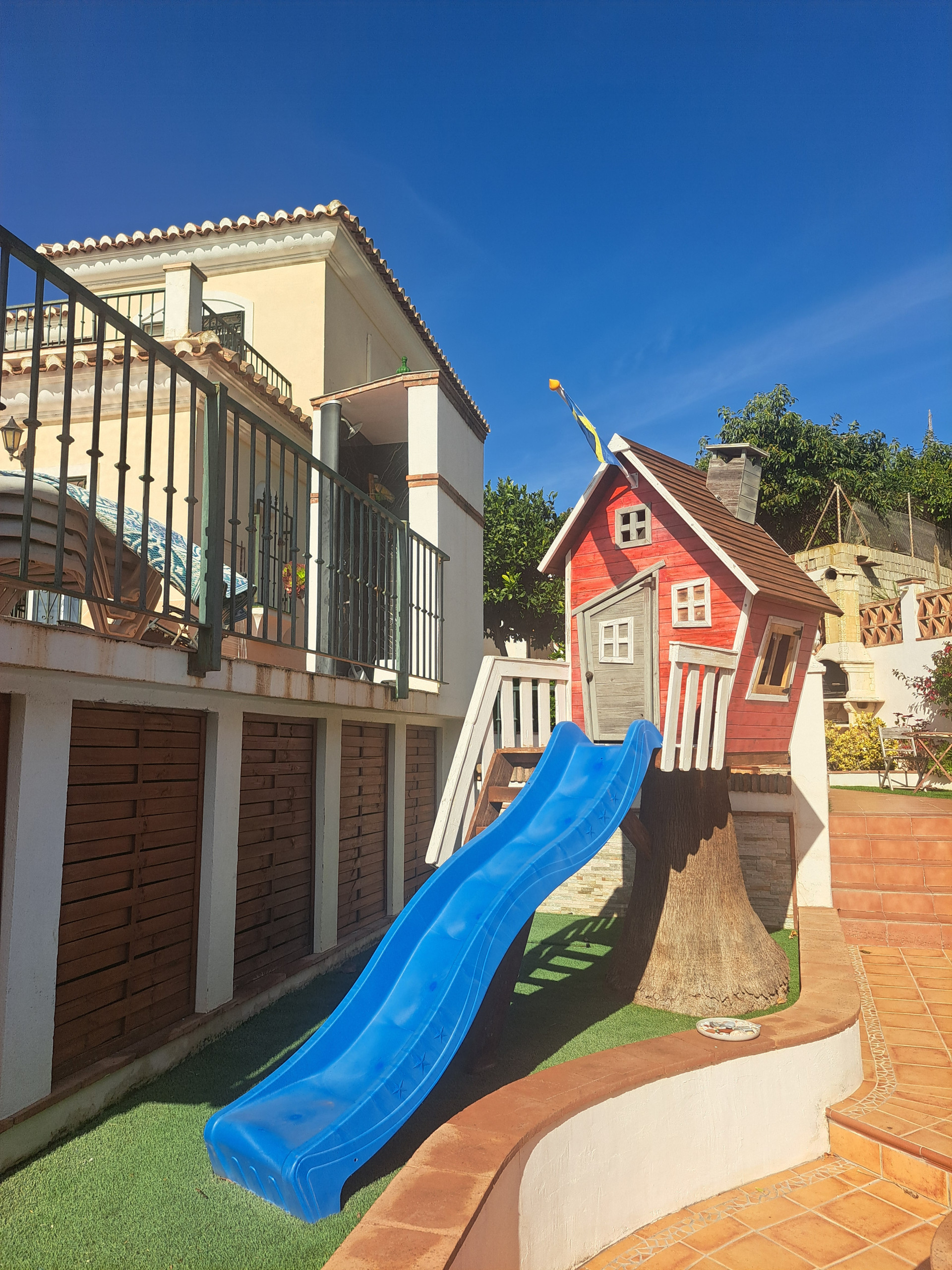 On the left side of the terrace there is a beautiful chill out zone with a comfortable sofa, table and BBQ. From here there are some steps that take you to the children’s play area with a small play house with a slide and a sand box with toys. There are sunbeds in this area too so you can enjoy the sun and watch your children