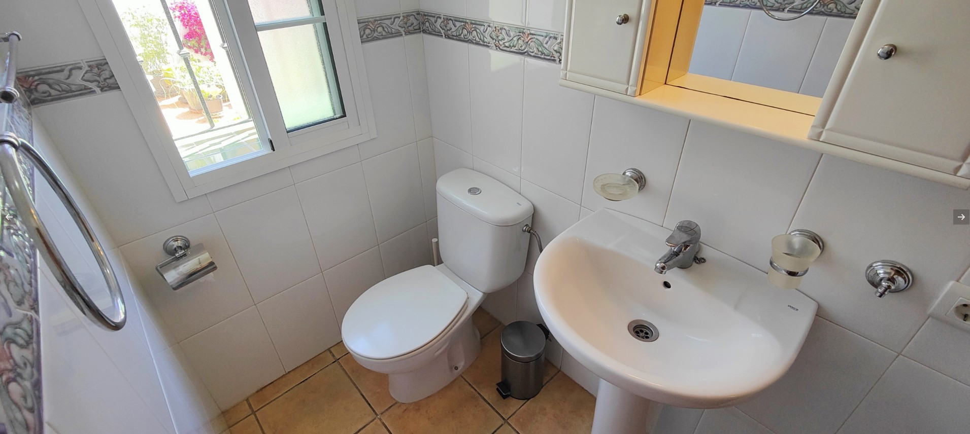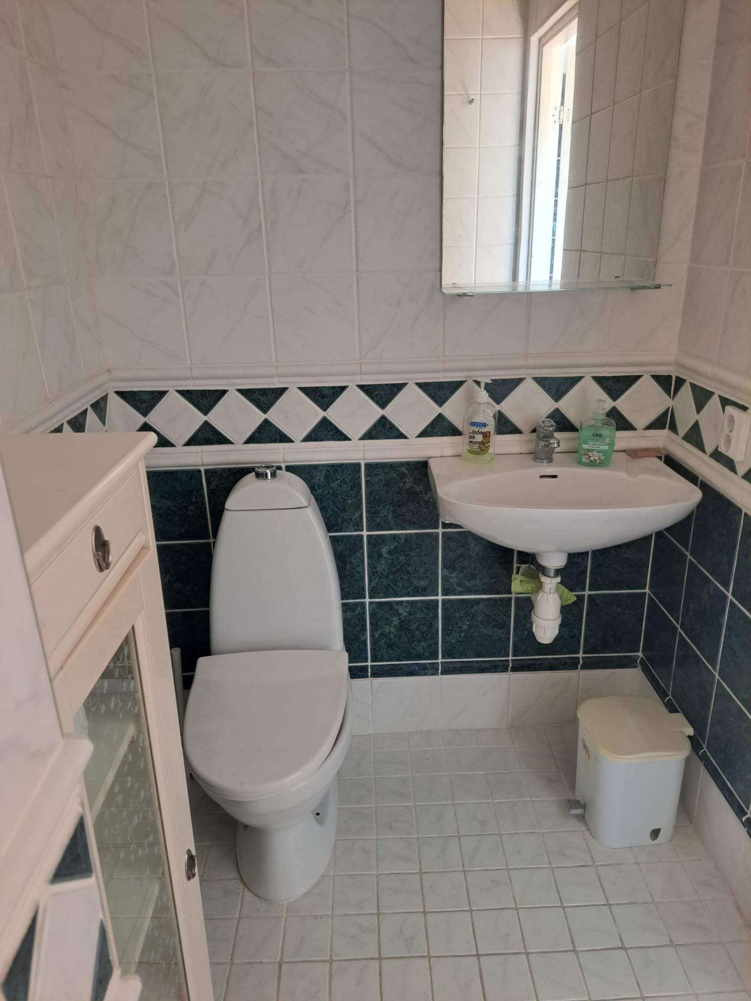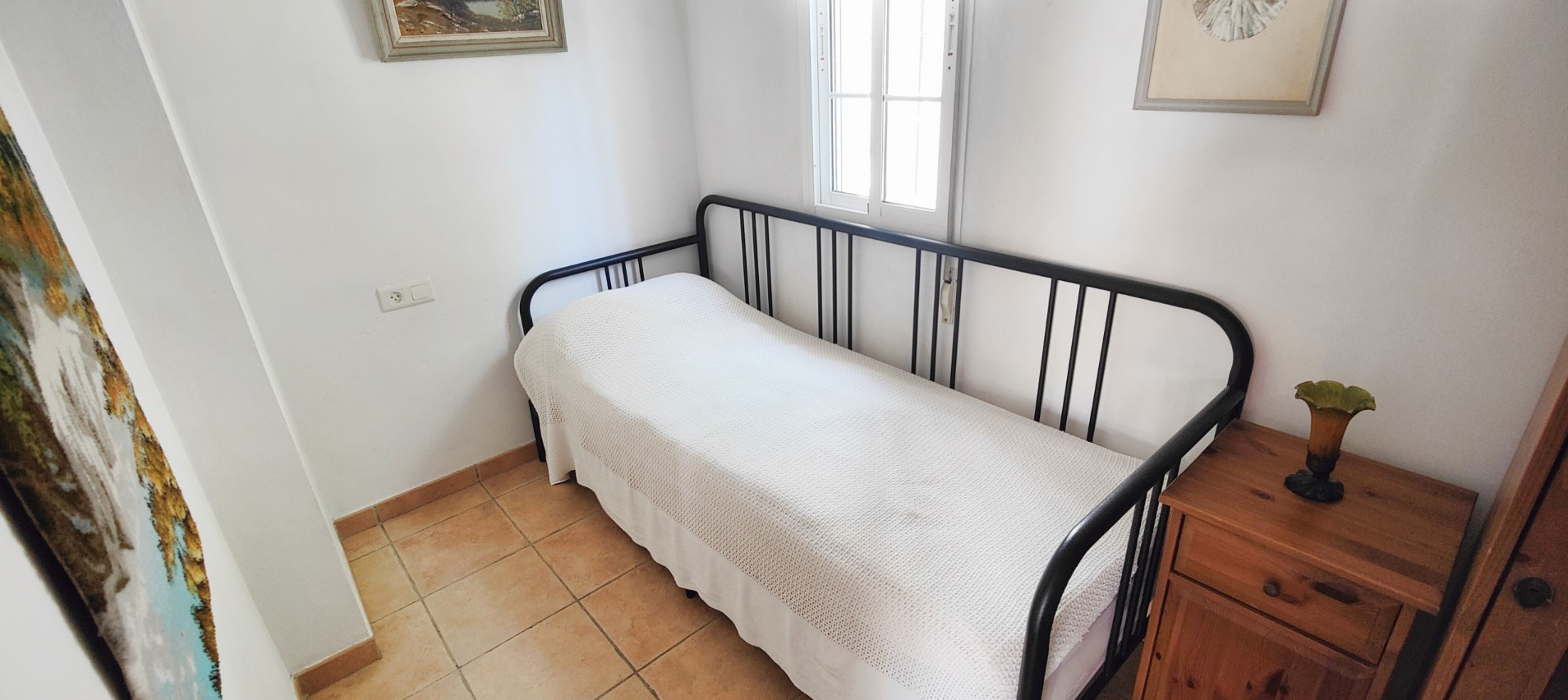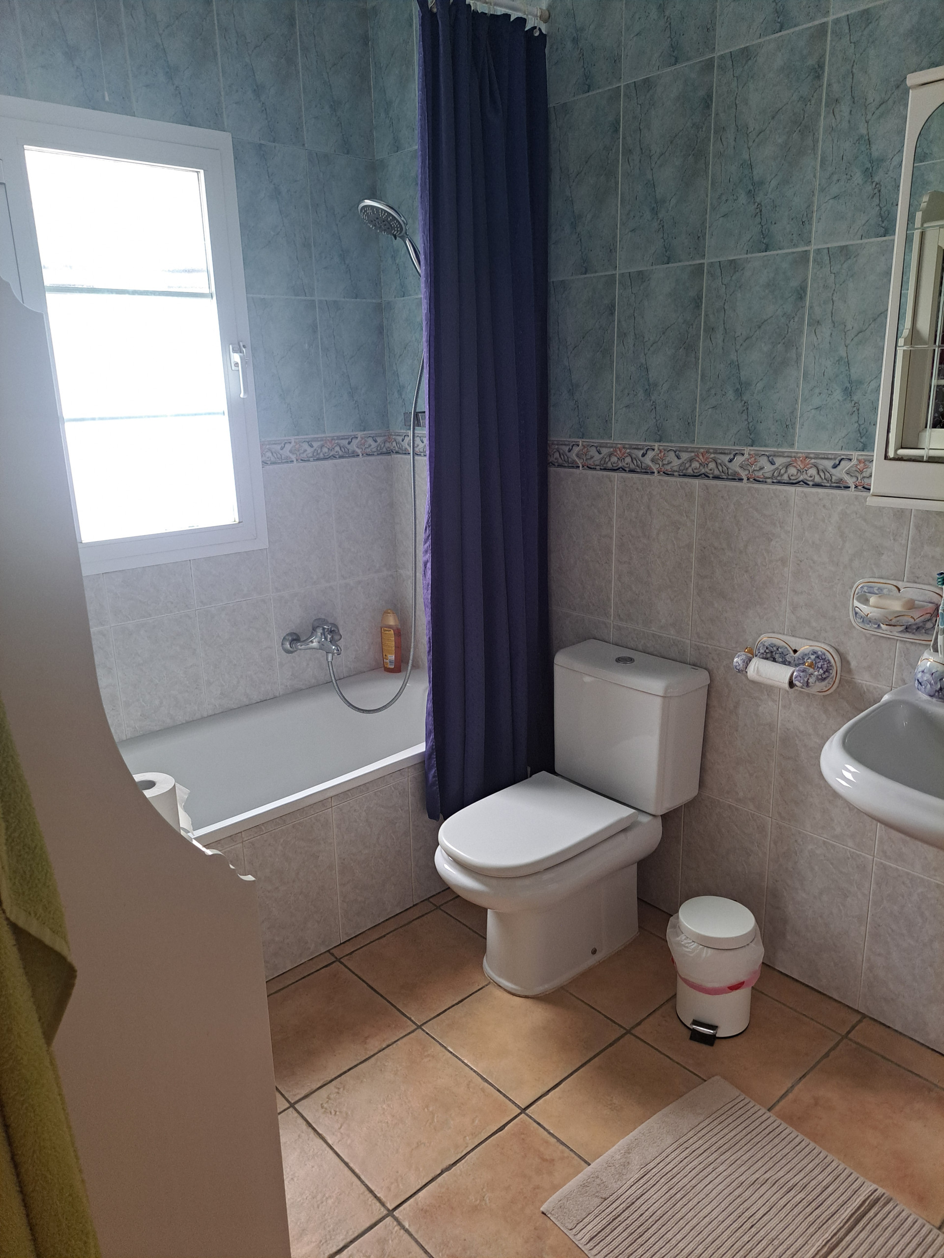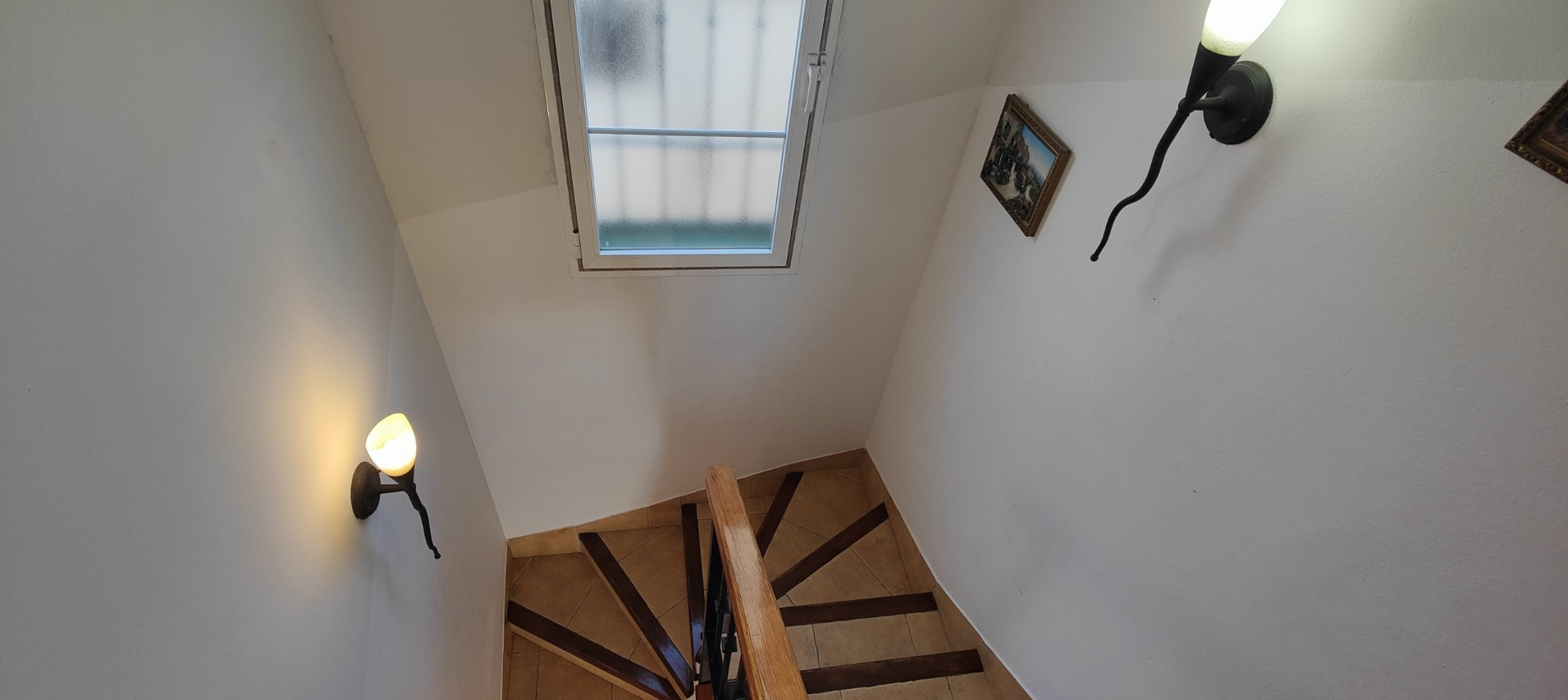When entering there is a large gated private parking space for up to two cars, the living space is distributed over 2 floors and consists of the following: the ground floor has one small bedroom with a single bed and a wardrobe, a guest toilet, a fully-fitted kitchen that is equipped with all the necessary utensils, crockery, fridge-freezer, electric oven and ceramic hob, toaster, coffee machine, microwave, washing machine and dishwasher.