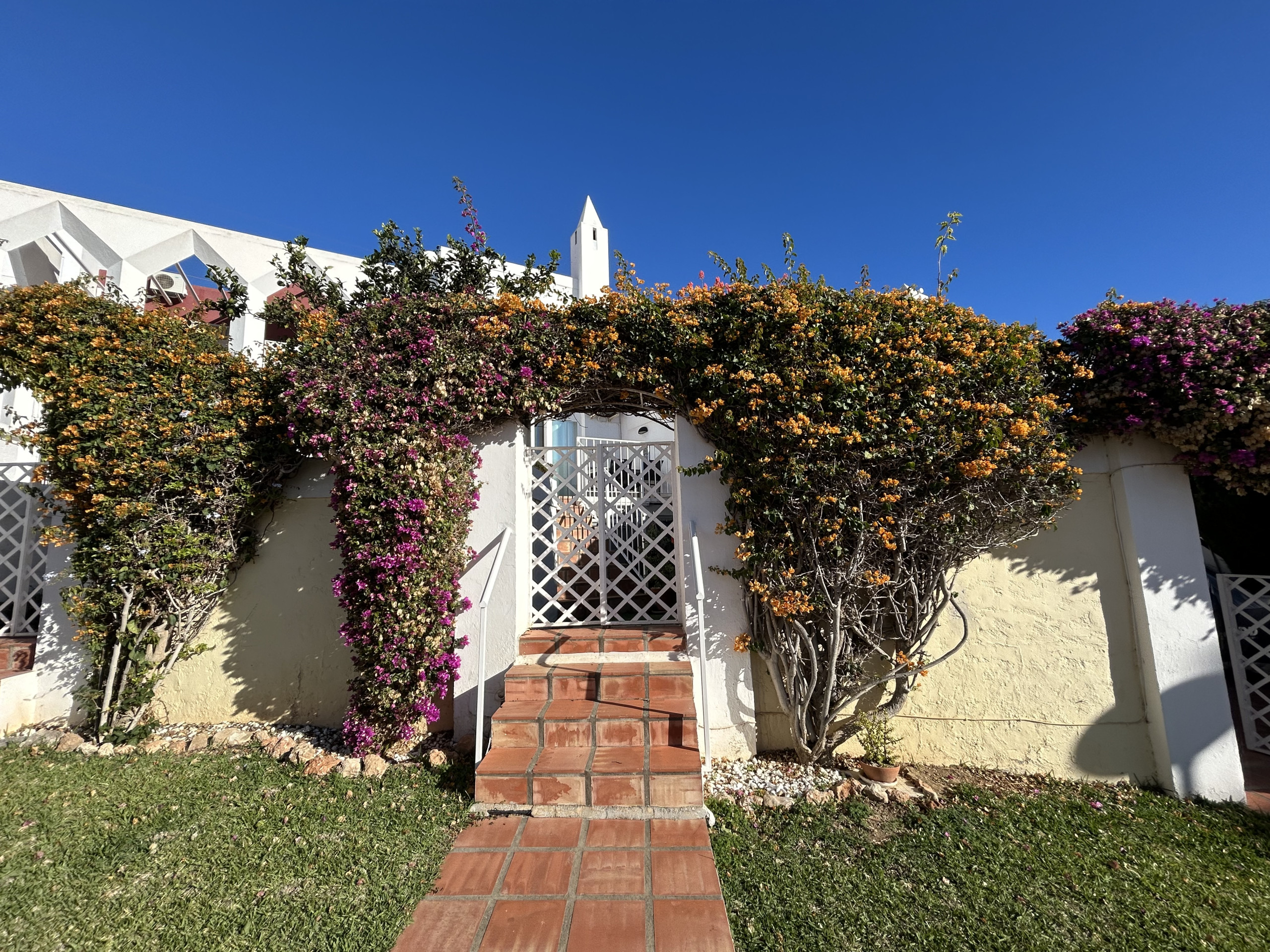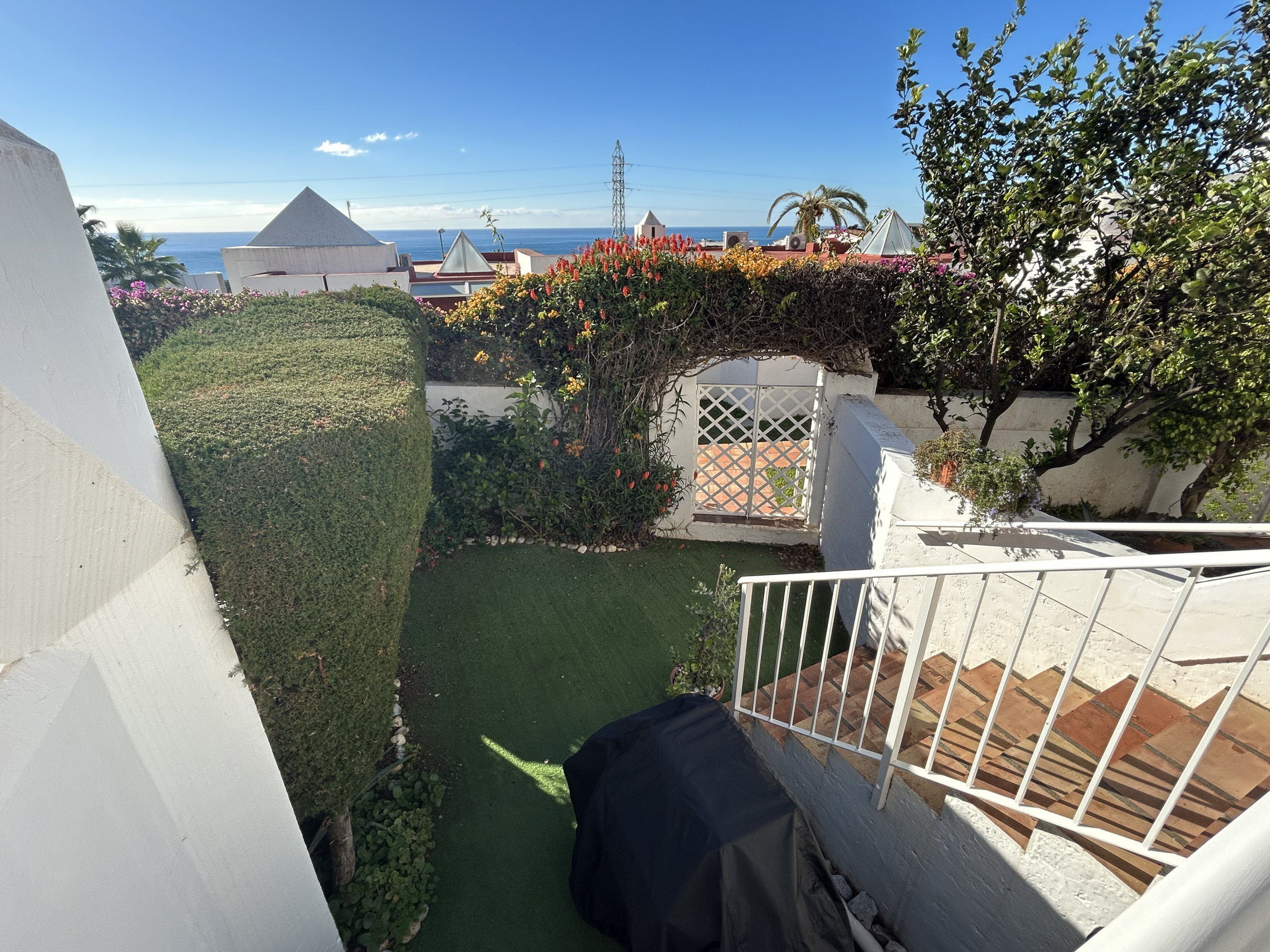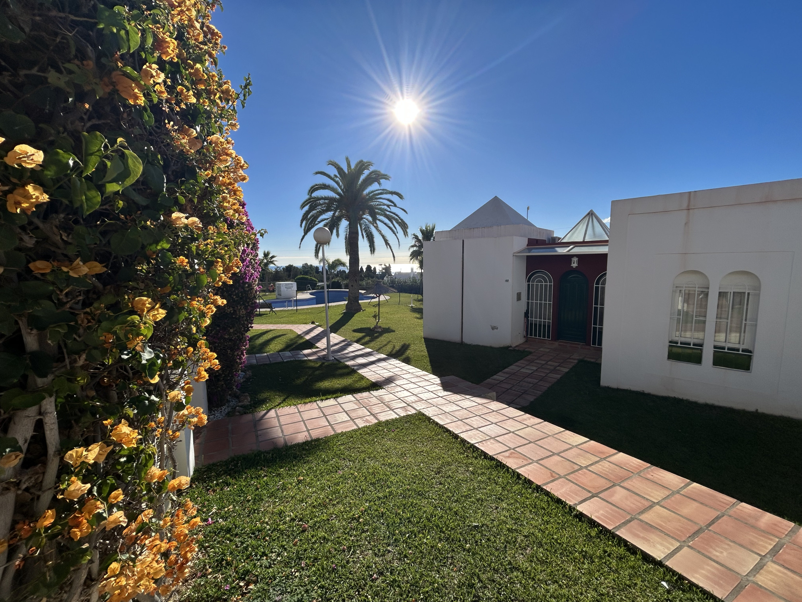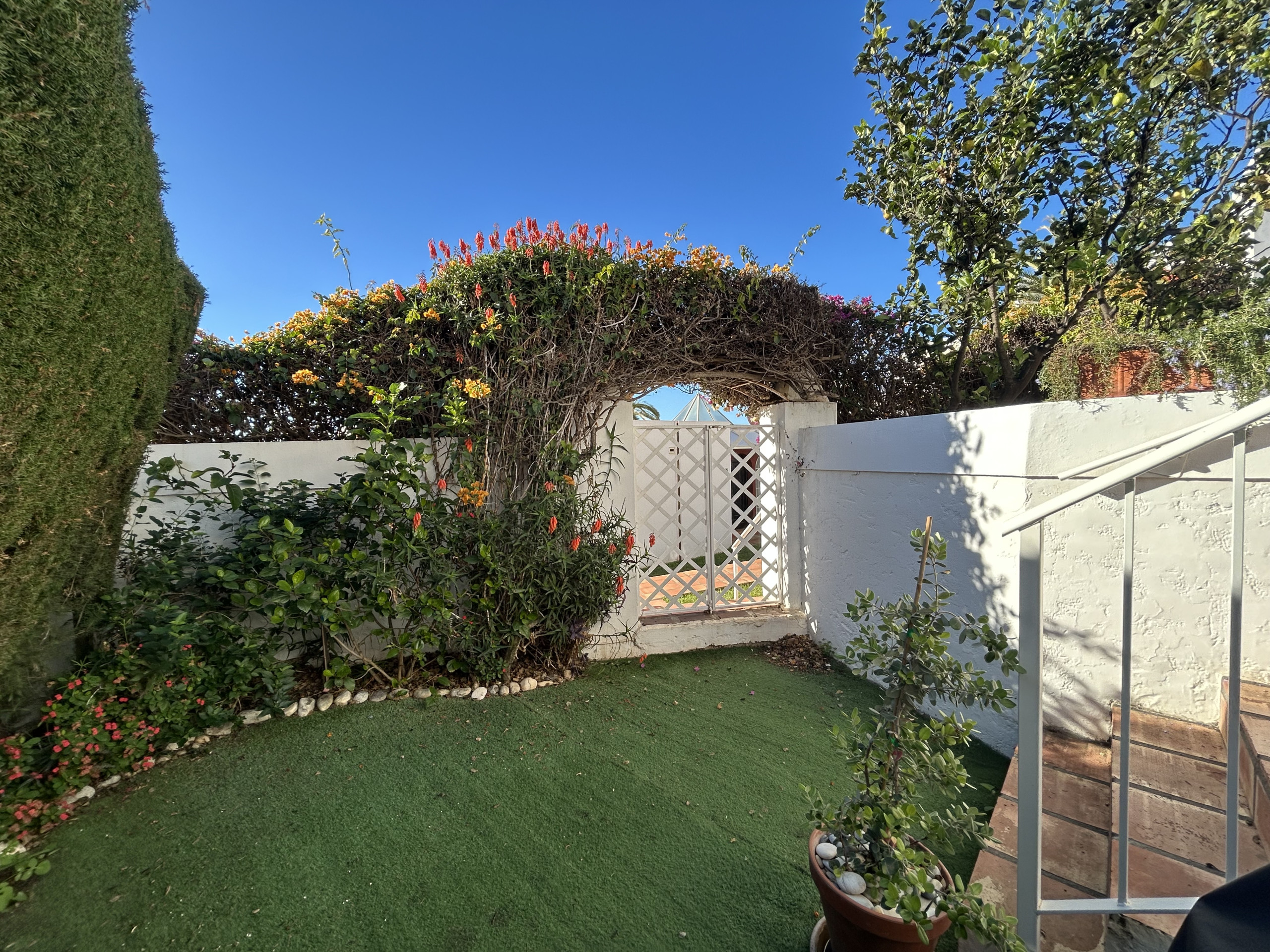 From the living room you can go directly out onto the lower terrace, which is a lovely patio with both sunbeds and dining area. There is a small garden with a gate and from here it is only 50 meters to the pool area.